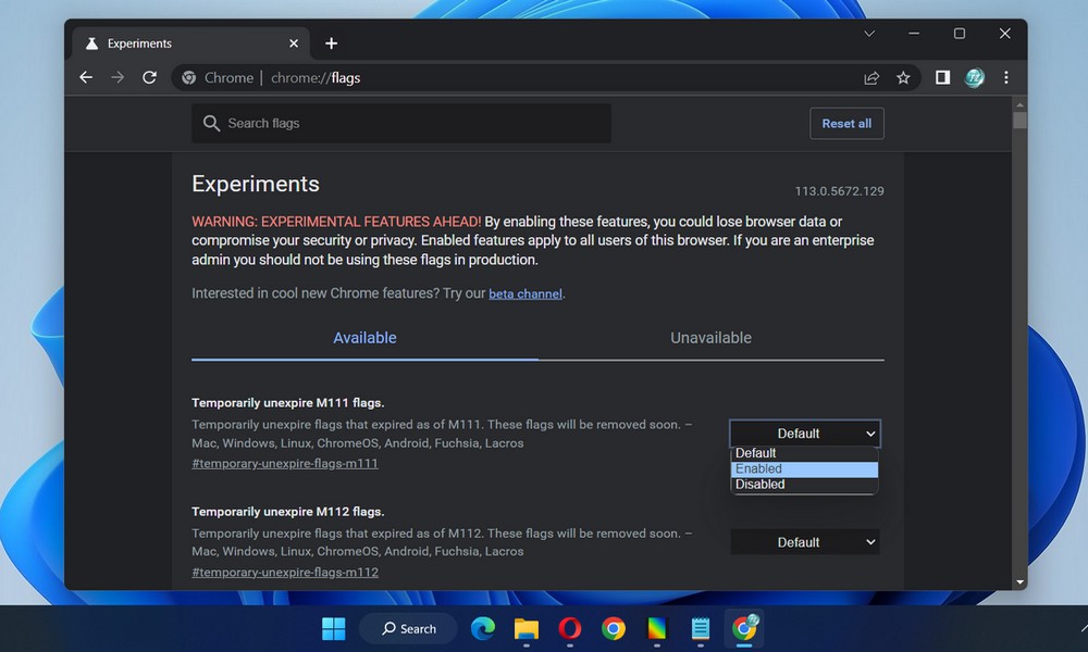 - Once you locate the experimental flag you want to enable, click on the drop-down menu next to it and select Enabled. In some cases, you might also find flags labeled as “Default” or “Disabled” initially.