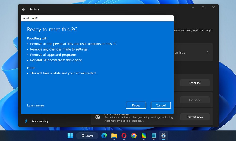 10. Finally, click on the Reset button to initiate the factory reset process. Your PC will restart and the reset process will begin. This may take some time to complete.